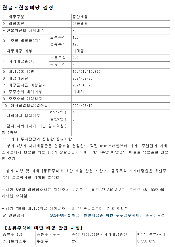 위 개요에서 언급해 드린 대로 100원을 현물 현금 배당했군요.