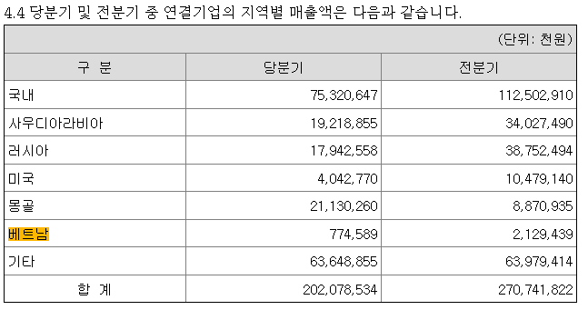 전분기 대비 당분기의 국내, 사우디, 러시아 매출액은 확연히 줄었습니다.