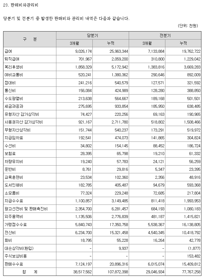 주석 23. 판매비와 관리비 항목입니다.