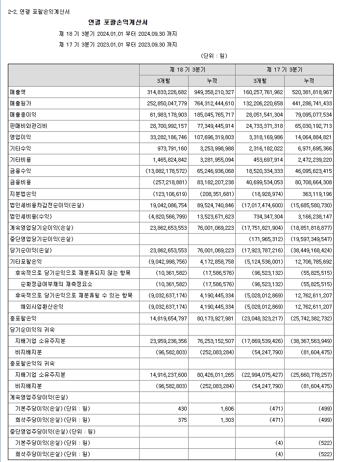 최근 분기보고서를 보겠습니다.