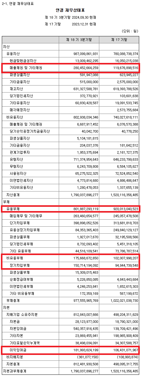 [서진시스템 3 Q24 분기보고서 中 재무상태표]