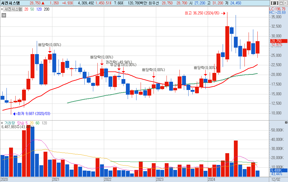 서진시스템 월봉 차트입니다.