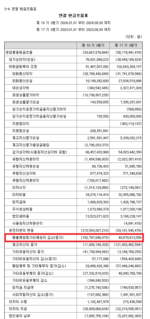 첫 번째. 매출채권 및 기타 채권의 증가 1,607억 원