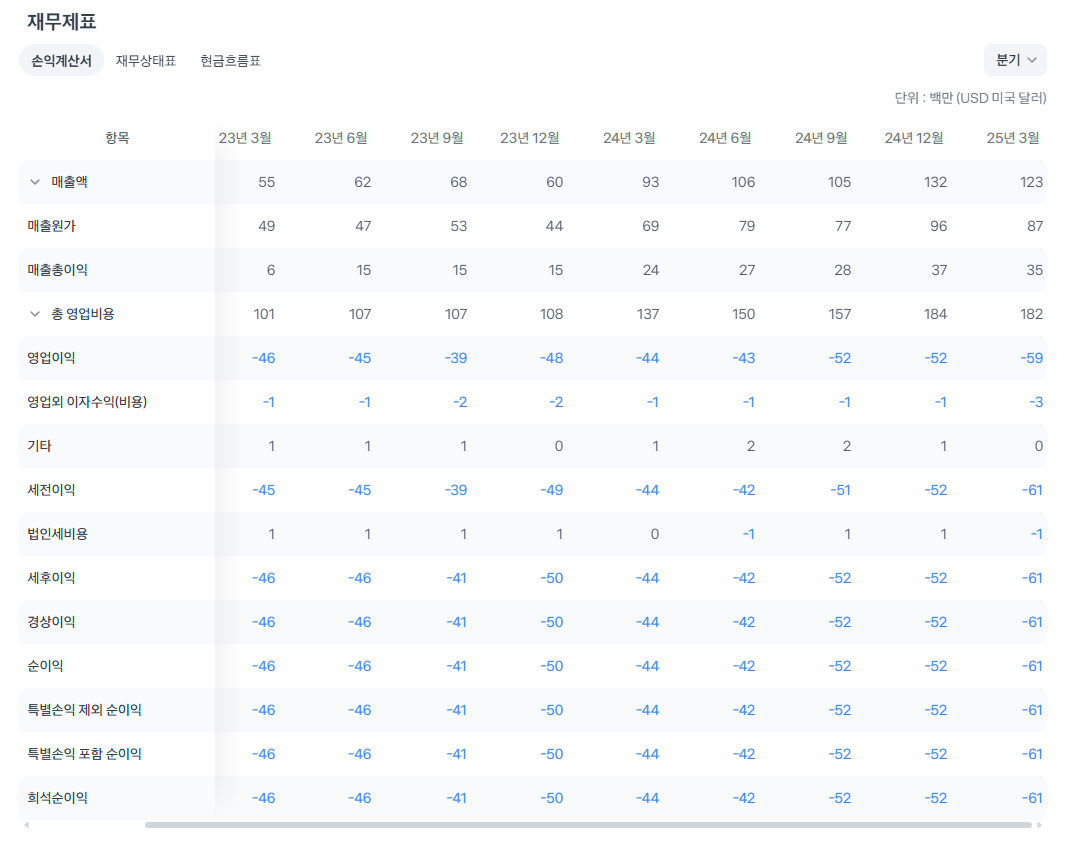 최근 4분기 평균 약 $40~50백만 /분기 수준으로 결손금이
