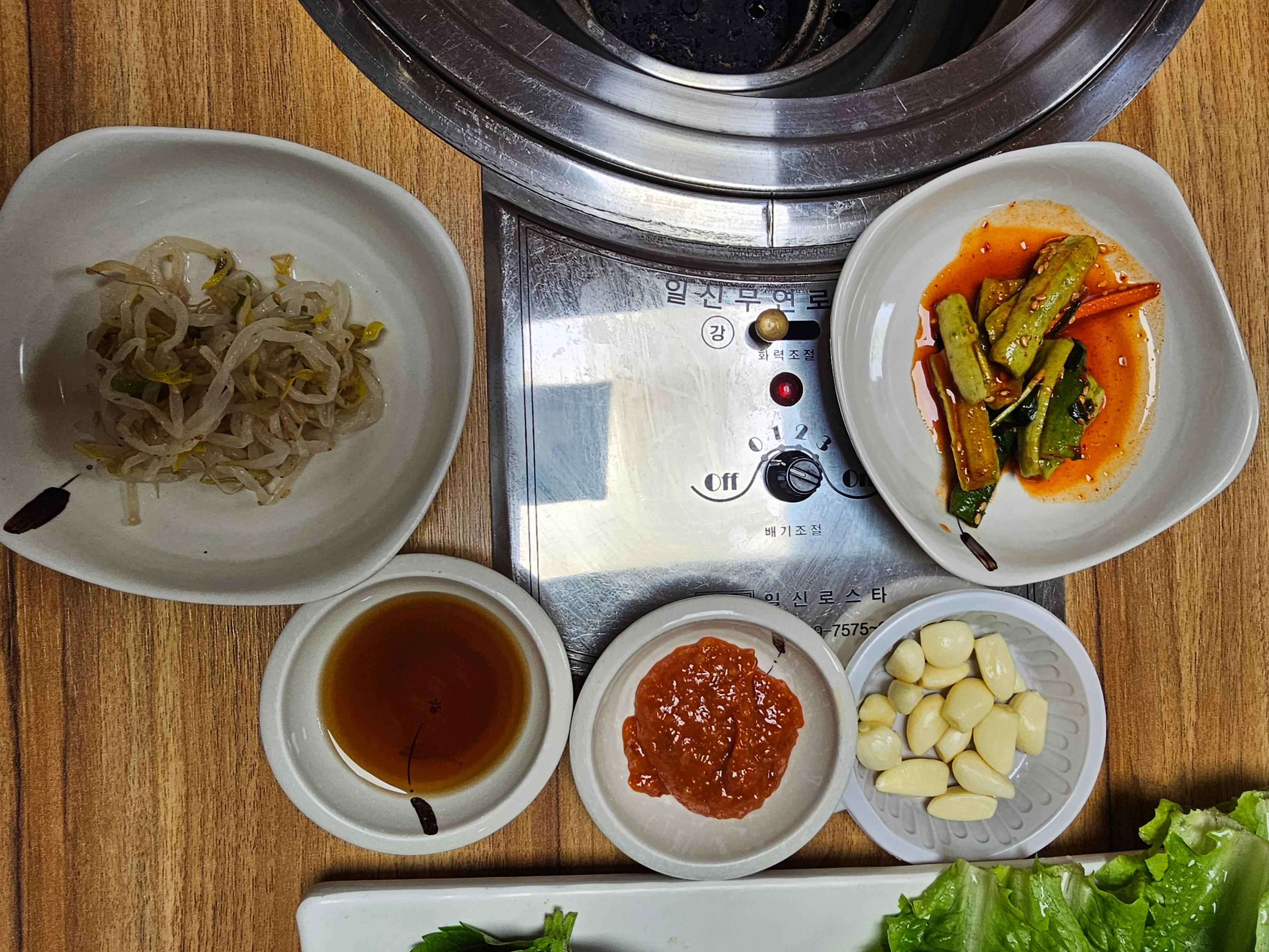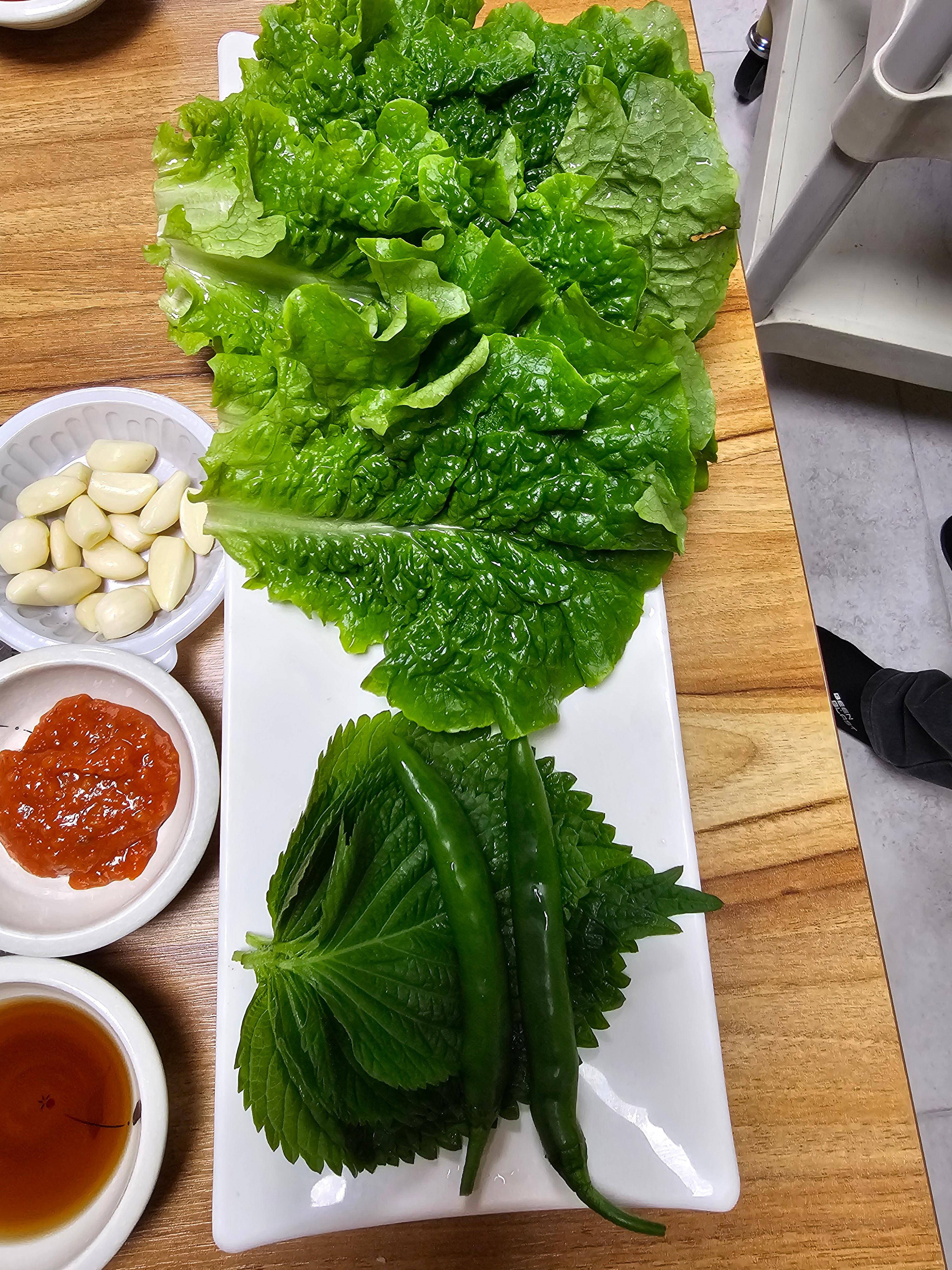 쌈, 쌈장, 묵, 숙주나물, 김치류가 제공됩니다.